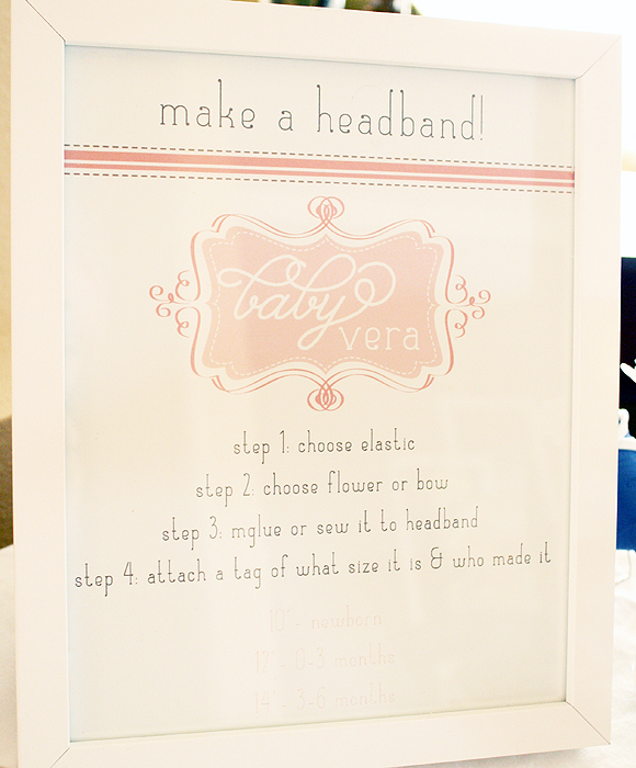 In lieu of games, we decided to get crafty instead! Abby (from Three Little Acorns) created a ‘Make a Headband’ station for baby Vera. She made about a million flowers that were later crafted into headbands and clips by the guests at the party. (We saw this cute idea here.)