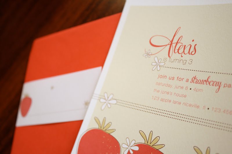 As a designer I love a complete design experience from the outside in. For example, coordinating colored envelopes with the address label and opening up to the invitation. At the actual birthday party you could carry on the entire idea with the vintage color scheme, a coordinating birthday banner and cupcake toppers (strawberry cupcakes of course), favor tags with strawberry candy or strawberry jam… I could go on and on.
