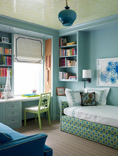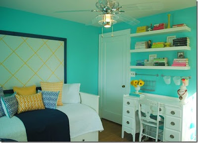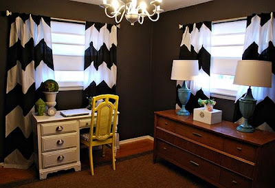 +{I fell in love with this color palette. And even though the yellow furniture piece is a dresser I could easily see a beautiful, yellow desk in it’s place. The layout shown here could be redone in our current guest room with relative ease.}