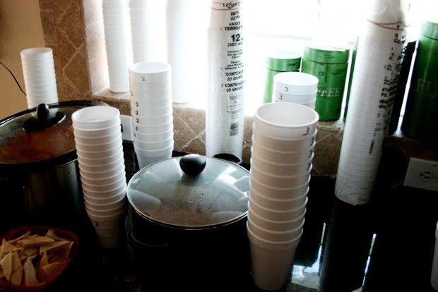 It is a chili cook off so each person attending gets a bag of 5 beans for voting for their favorite chili… to be dispersed as they wish. There are tasting cups for each pot of chili and the cups are numbered accordingly (this helps you keep track of your favorites), each pot then has a jar in front where you can do your voting.