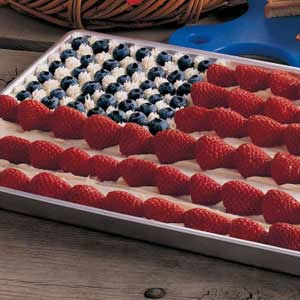 - In a large bowl, beat the cream cheese, sugar and lemon juice until smooth. Set aside 1/4 cup. Spread remaining cream cheese mixture over crust.Decorate with blueberries and strawberries to resemble a flag.