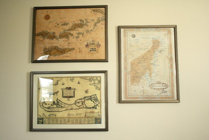 A few throw pillows were added with a teeny pop of color for interest. The homeowner had a collection of old maps that he loved and because there color palette was too perfect to not use in this space I framed them and hung three of them above the sofa as a great focal point to the room.
